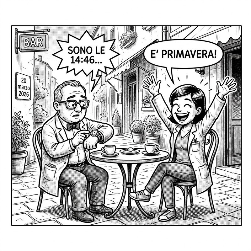 Come raccontato nella vignetta qui sopra, che ho generato grazie a Gemini, l'arrivo della primavera è definito da un istante ben preciso, che cambia di anno in anno. Questo istante è il momento esatto in cui i raggi del Sole risultano perpendicolari rispetto all'asse di rotazione terrestre. Quando ciò avviene siamo in equinozio, ovvero quando le ore notturne hanno la medesima durata di quelle diurne. Questo avviene in tutte le zone della Terra in cui il Sole è alto sopra l'orizzonte. Ovviamente ci sono